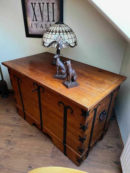 Na sprzedaż wyjątkowa, solidna drewniana skrzynia o imponujących wymiarach 127 × 85 × 72 cm, wykonana z litego drewna i ...